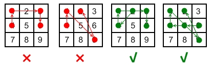 - If the line connecting two consecutive keys in the pattern passes through any other keys, the other keys must have previously selected in the pattern. No jumps through non selected key is allowed.